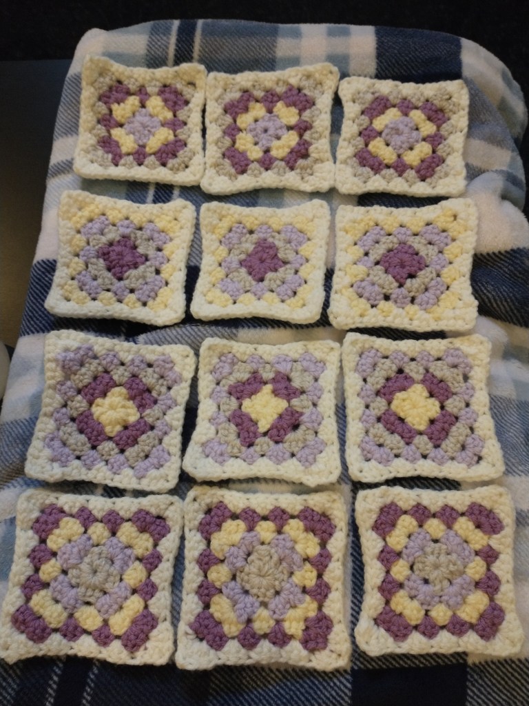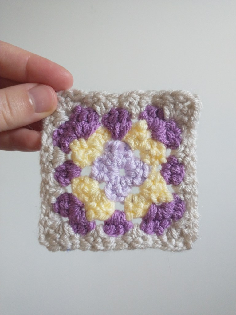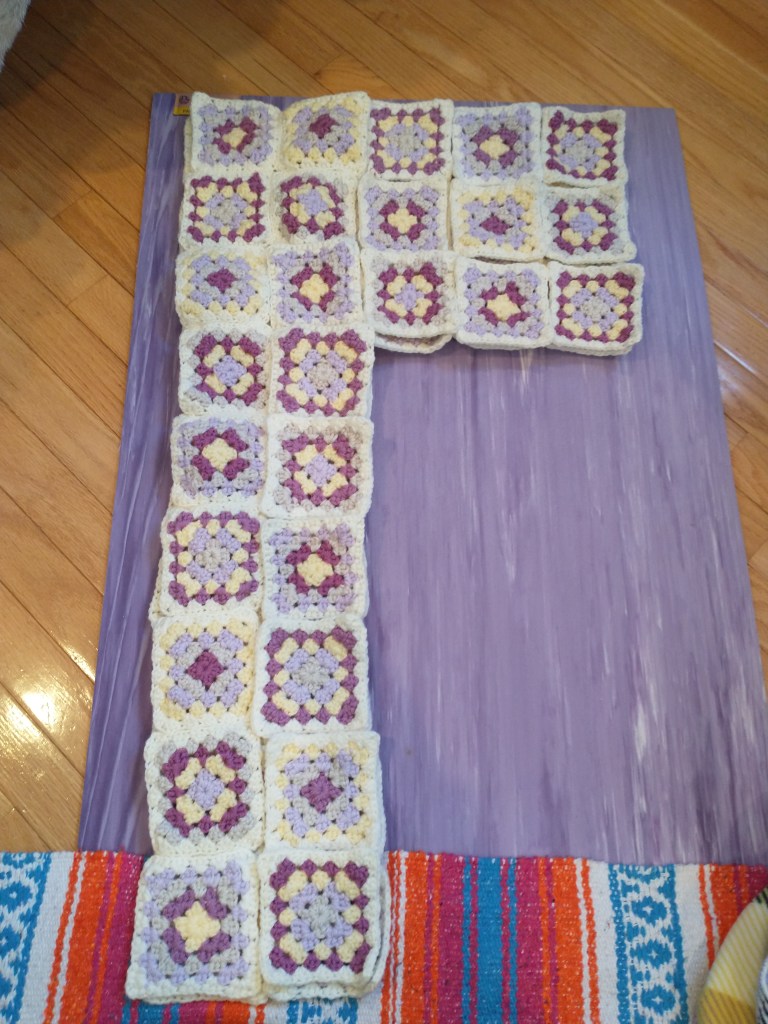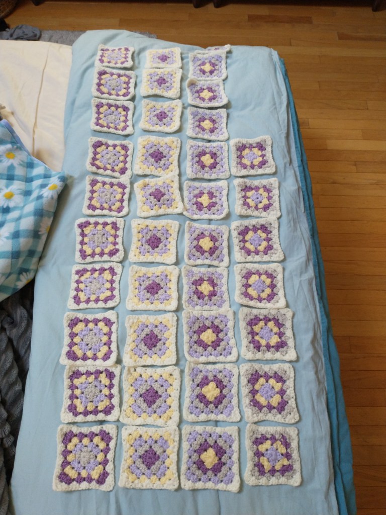 I used nautikrallcrochet‘s YouTube tutorial How to Crochet the Perfect Granny Square (with no twisting or swirling) to crochet my granny squares. I found this tutorial very helpful and easy to follow, since I had to make over 100 of these! The best advice was to tie in your ends as you go. Since I was using 4 different colors for each granny square, each color resulted in two ends. It was much less frustrating for me to use a needle and thread to wrangle the yarn and hide it into the square; this is my preferred method versus crocheting it in. This was just faster for me and created a neat, tight finish.
