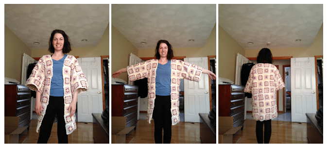 My biggest concern were the sleeves. I did not want tight armpits for this coat cardigan. I wanted it to have a bit of room. Because of the size of my granny square, measuring 3.5 x 3.5 inches, I chose to make my sleeves 3 rows wide. This ended up with a more voluminous sleeve, adding a stylish flare silhouette.