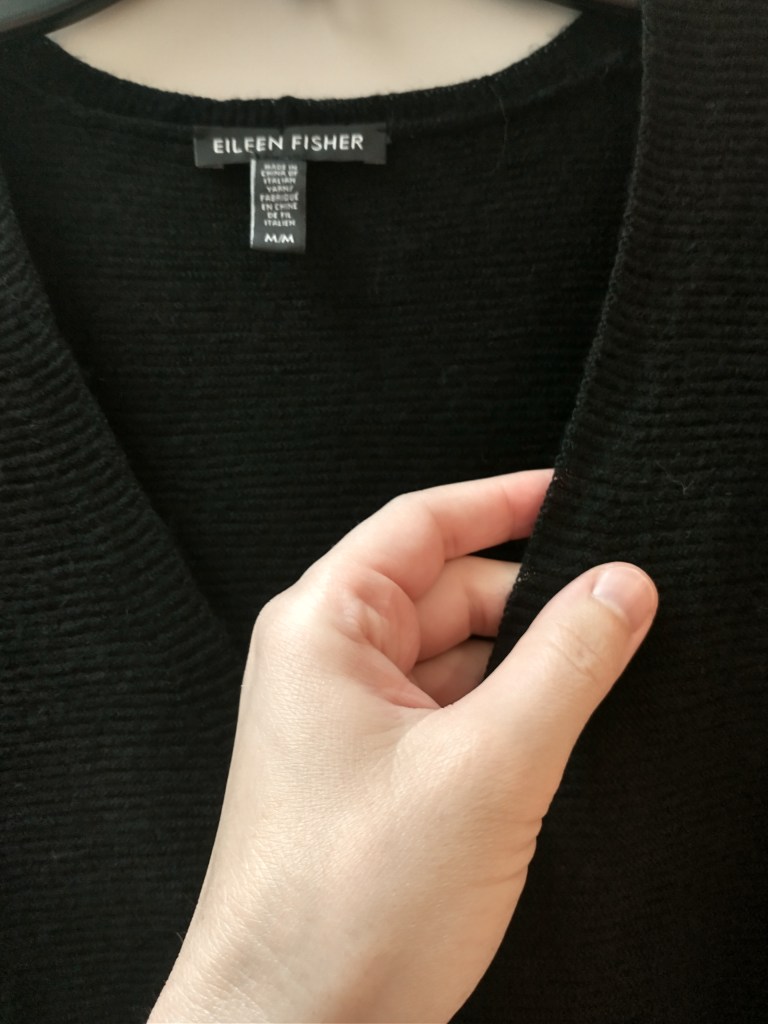 After trying on a few pieces, I decided that this merino V-neck sweater was coming home with me. I watched as the sales associate folded and tissue wrapped this garment and placed it in a crisp dark gray Eileen Fisher paper tote bag with cloth handles. I rarely go in-person clothes shopping anymore, if not thrifting, and usually bring my own bags, but didn’t bring any on this occasion and once I saw the sales associate open this bag I appreciated and welcomed this bag because it was part of the experience. I know, a lot for a bag but I was shopping in an Eileen Fisher store and I am a millennial and am still nostalgic for that complete shopping experience. I spent $55 plus tax for this finely made Eileen Fisher sweater and was excited to add this into my wardrobe, a staple piece for those cooler Bay Area days.