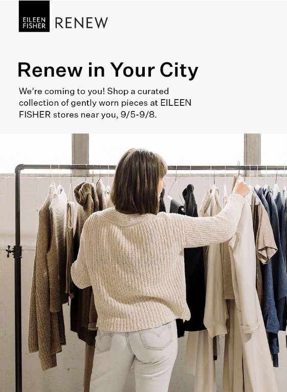 You can check to see if an Eileen Fisher Renew pop-up is coming near you by checking on the Events page on the Eileen Fisher Renew site or subscribe to their email list.
